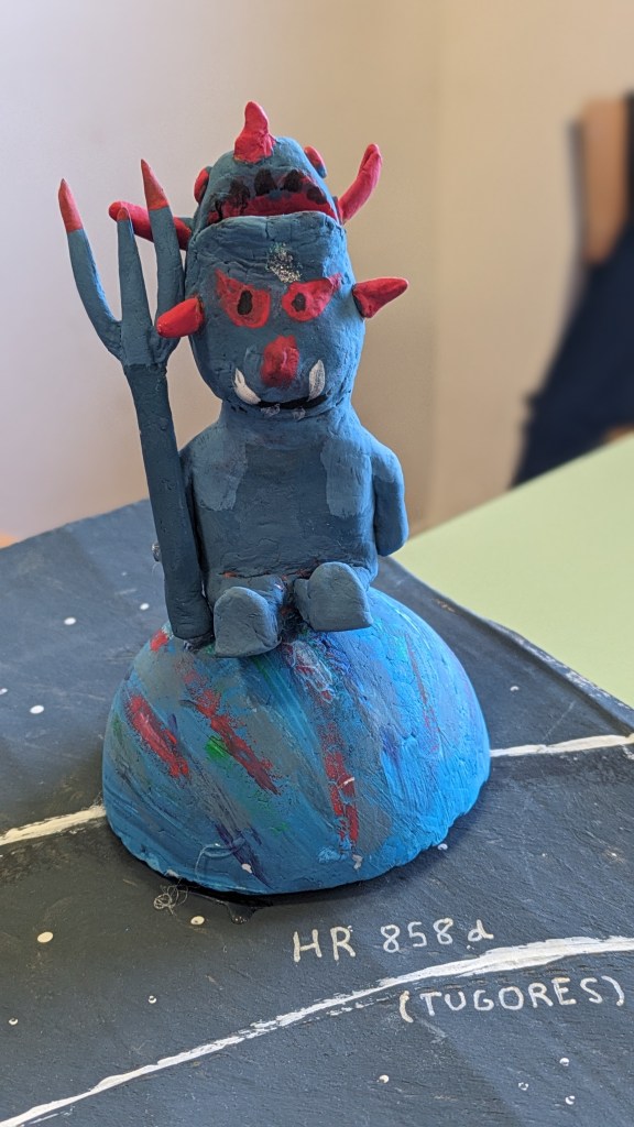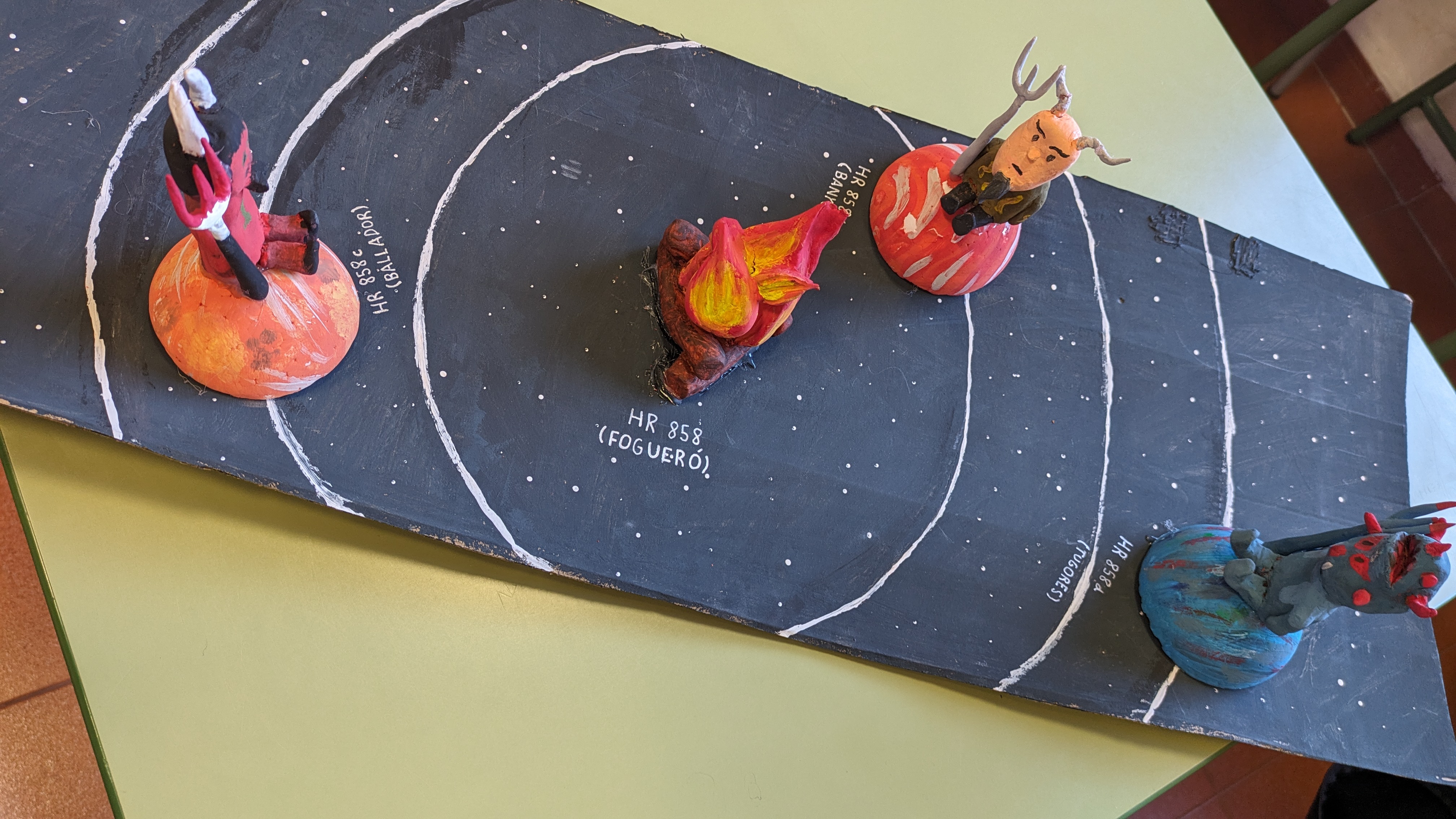 Na Rosa, la representant de l’equip, va travessar les ànimes dels assistents amb la seva fervorosa defensa. Començà mostrant una perfecta maqueta de l’esmentat sistema en el que els planetes – dimonions ballen al voltant de l’estrella Fogueró.